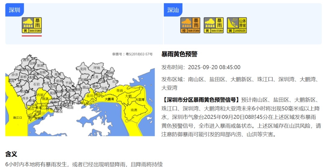 【深圳市分区暴雨黄色预警信号】预计南山区、盐田区、大鹏新区、珠江口、深圳湾、大鹏湾和大亚湾未来6小时将出现50毫米或以上降水,深圳市气象台2025年09月20日08时45分在上述区域发布暴雨黄色预警信号,全市进入暴雨戒备状态。上述区域存在山洪风险,请注意防御暴雨可能引发的局部内涝、山洪等灾害。