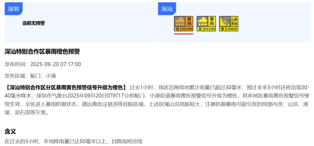 【深汕特别合作区分区暴雨黄色预警信号升级为橙色】 过去1小时,我区沿海局地累计雨量已超过30毫米,预计未来3小时还将出现30-40毫米降水,深圳市气象台2025年09月20日07时17分将鲘门、小漠街道暴雨黄色预警信号升级为橙色,其余地区暴雨黄色预警信号继续生效,全区进入暴雨防御状态,请远离低洼易涝等危险区域,上述区域山洪风险较大,注意防御暴雨可能引发的局部内涝、山洪、滑坡、泥石流等灾害。