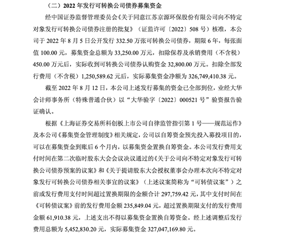 根据京源环保公告,该笔可转债规模为3.325亿元,保荐及承销费用(不含税)为450万元。该笔可转债于2022年8月25日在上交所挂牌交易,简称“京源转债”,期限为6年,2028年8月4日到期,并约定自2023年2月13日起进入转股期。