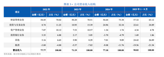 从收入构成看,2022-2024年,方正证券都以财富管理业务收入来源为主,分别实现收入54.45亿元、50.2亿元、56.64亿元,占比均保持在70%以上。2025年前三季度,公司财富管理业务收入57.32亿元,同比增长69.07%。